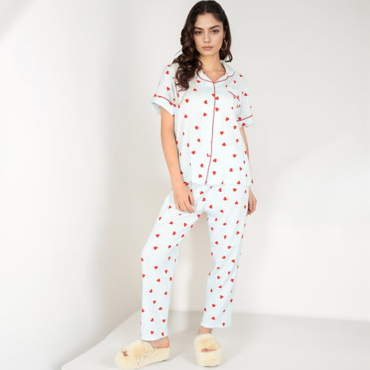 Anna-Kaci Women's Red Heart Print Pajama Set with Short Sleeve Button-Up Top and Relaxed Fit Elastic Waist Pants