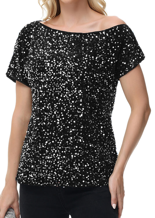 Anna-Kaci Women's Sequin One Shoulder Short Sleeve Top Party Club Sparkle Glitter Concert Tunic Blouse