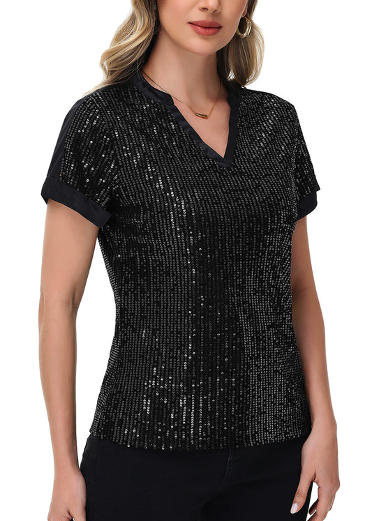 Anna-Kaci Women's Sequin Top Shirt Short Sleeve with Satin V Neckline Glitter Party Tunic Blouse