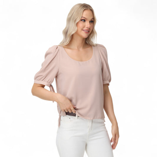 Anna-Kaci Women's Short Puff Sleeve Blouse with Scoop Neckline and Tie Cuff Detail for a Feminine Everyday Look