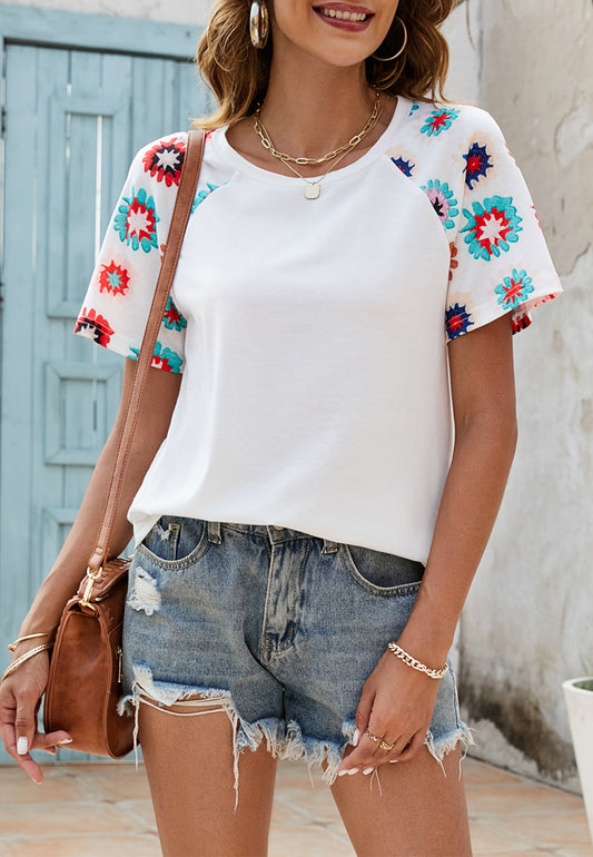 Anna-Kaci Women's Short Sleeve Pullover Shirt with Multicolor Embroidered Floral Pattern Sleeves and Relaxed Fit