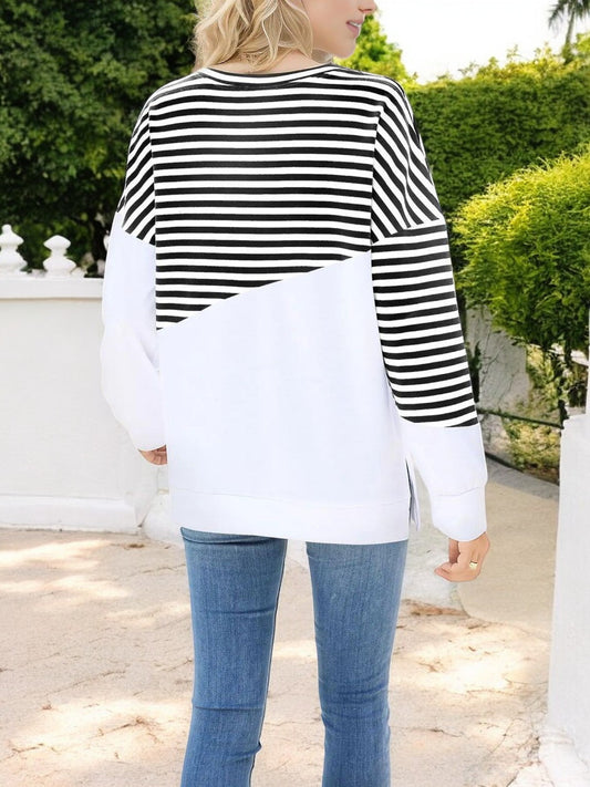 Anna-Kaci Women's Striped Crew Neck Sweatshirt with Contrast Sleeves