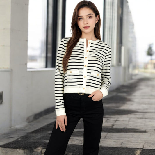 Anna-Kaci Women's Striped Button-Up Cardigan with Pocket Detail