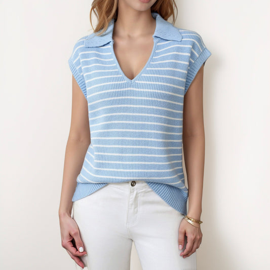 Anna-Kaci Women's Striped Collared Sleeveless Knit Top with Deep V-Neck and Ribbed Hem Detailing