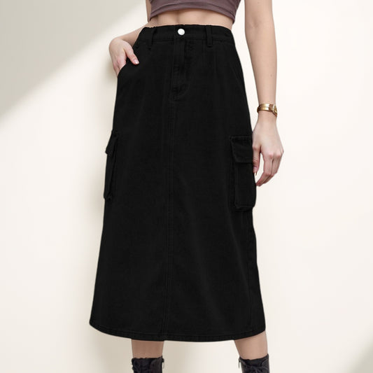 Anna-Kaci Women's Utility Midi Skirt with Side Cargo Pockets Button Waistband and Belt Loops