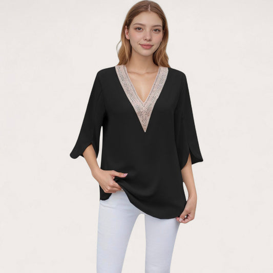 Anna-Kaci Women's V-Neck Blouse with Lace Trim Detail and 3/4 Split Sleeves Relaxed Fit