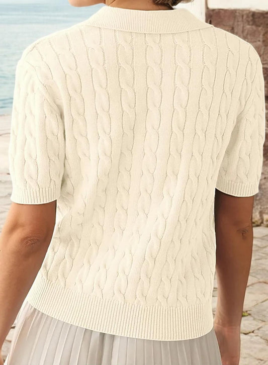 Collared Short Sleeve Cable Knit Top with Classic Fit