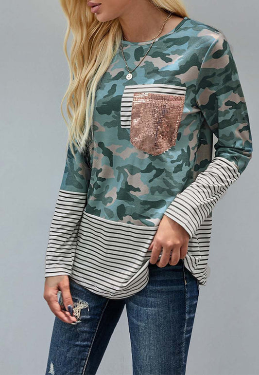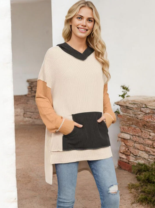 Color Block V-Neck Sweater with Long Sleeves and Front Pocket