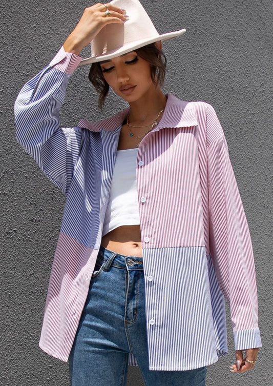 Color Block V-Neck Sweater with Heart Patterned Sleeves and Oversized Fit