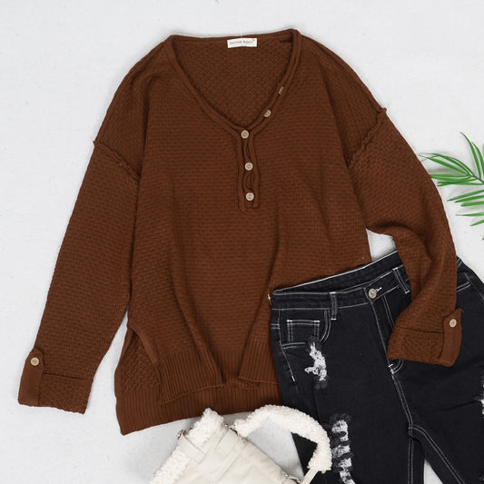 Contrast Button Detail Long Sleeve Textured Knit Sweater