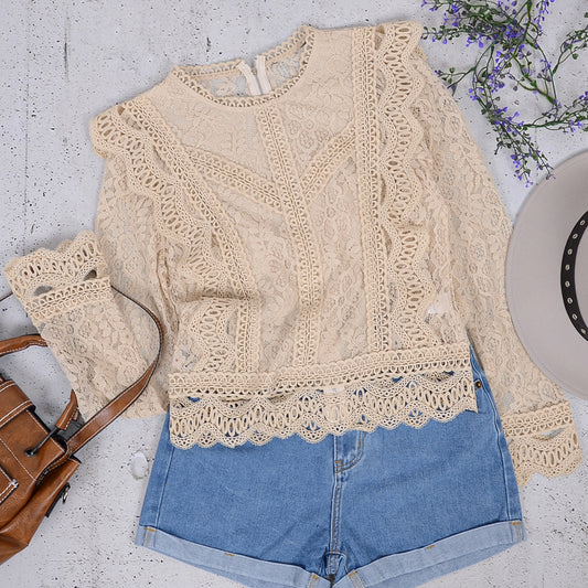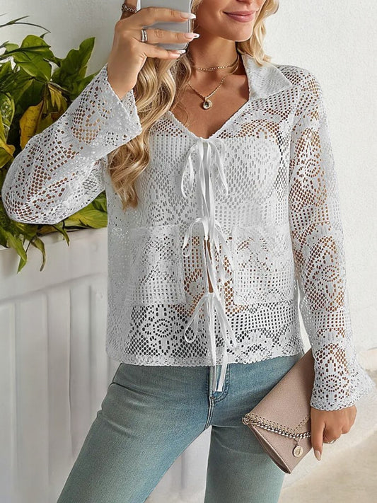Crochet Lace Tie-Front Blouse with Long Sleeves and Open Knit Design