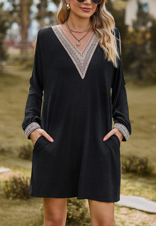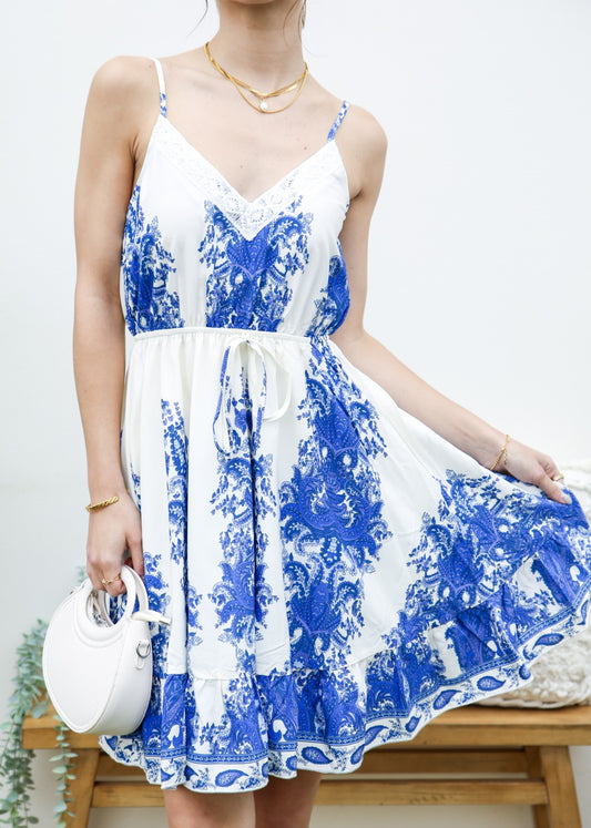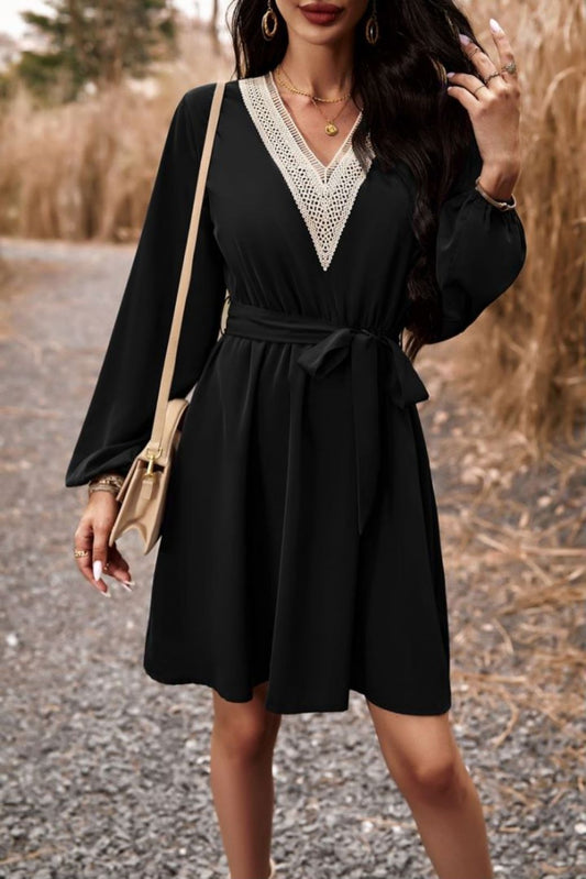 Crochet V-Neck Sleeveless Tie Waist Belted Ruffle Dress