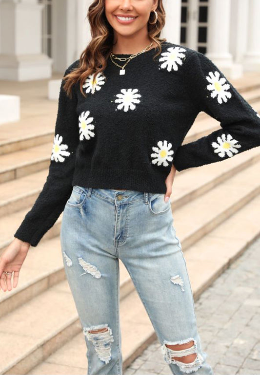 Daisy Flower Print Long Cuffed Sleeve Pullover Sweater