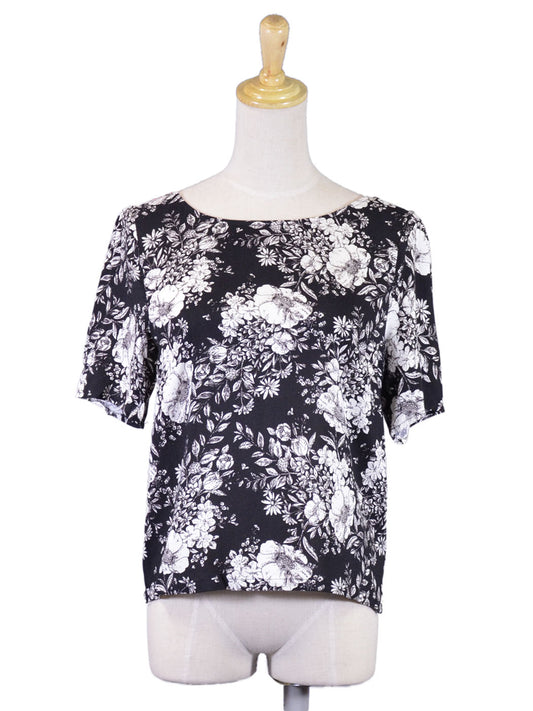 En Creme Lovely Wallpaper B&W Floral Print Short Sleeves Cutout Back Blouse Top