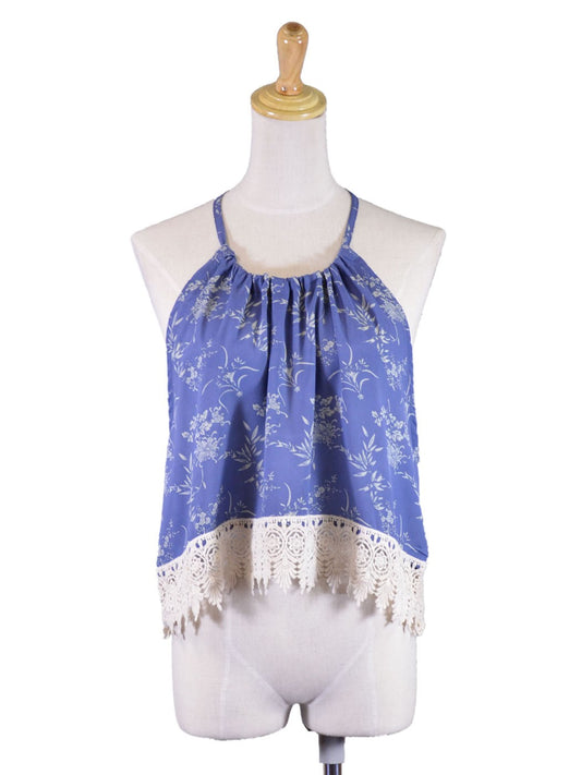 En Creme Oriental Floral Print Lace Trim Double T-Back Halter Blouse Top
