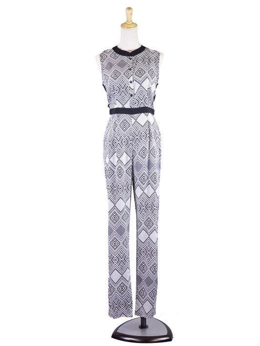 En Creme Froufrou Fun Black & White Diamond Button Up Sheer Open Back Jumpsuit