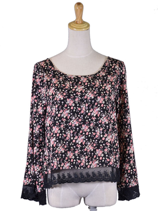 En Creme Sophia Floral Print Bell Sleeves Mesh Lace Hem Woven Scoop Neck Blouse