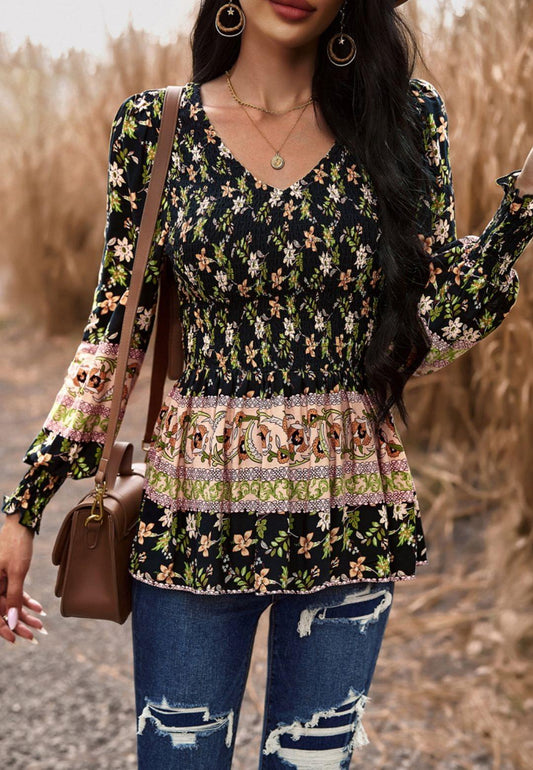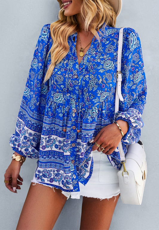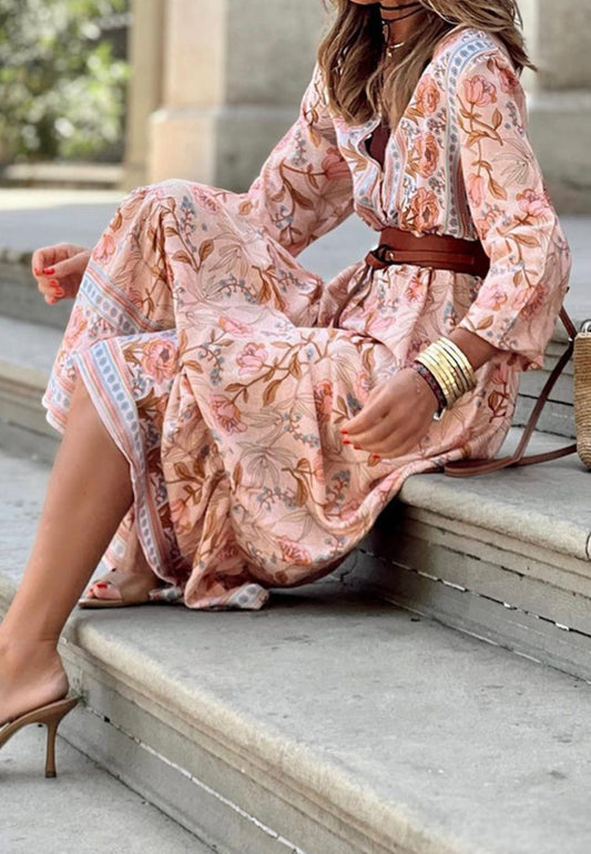 Floral Bohemian Printed Off Puffed Shoulder Flared Dress