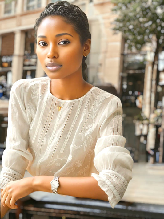 Flower Pattern Embroidery Hollowed Out Longitudinal Stretch Ramie Top