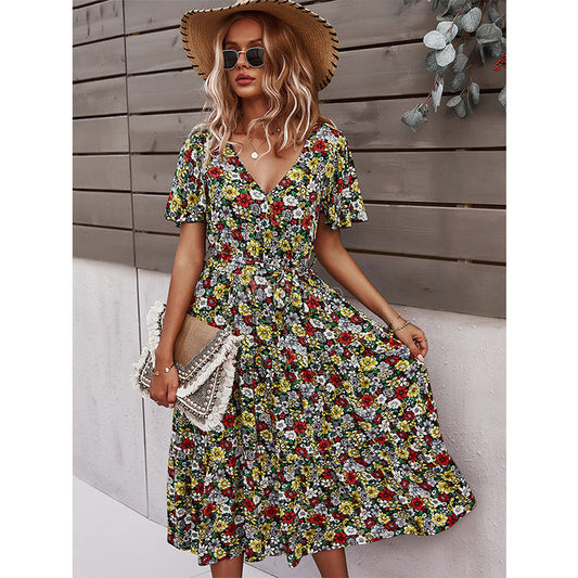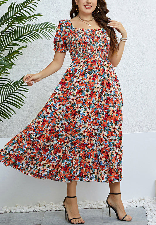 Flower Printed Smocked Check Ruffle Cap Sleeve Gathered Midi Dress