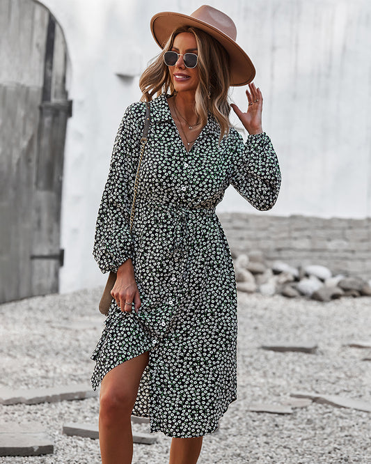 Floral Wrap Midi Dress with Ruffle Shoulders and Long Sleeves