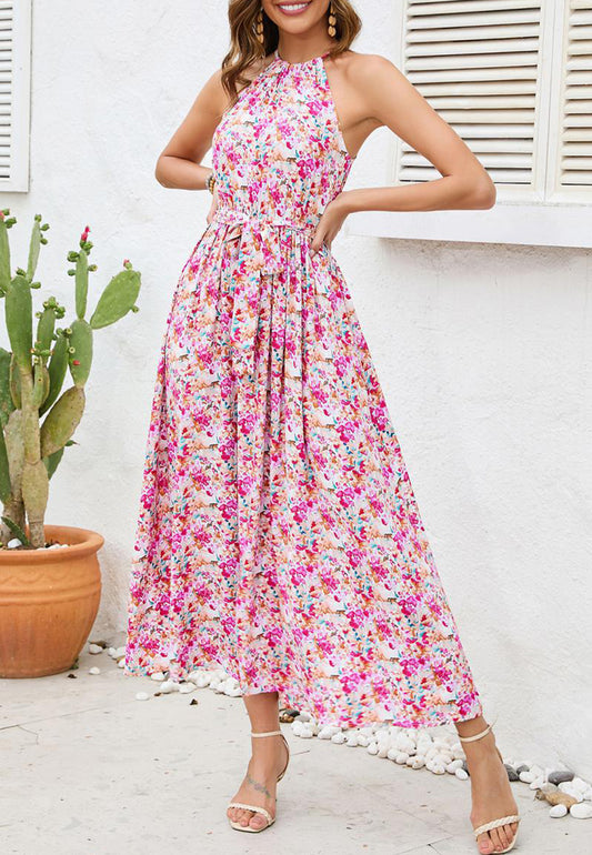 Halter Floral Printed Waist Belted Pleated Maxi Dress