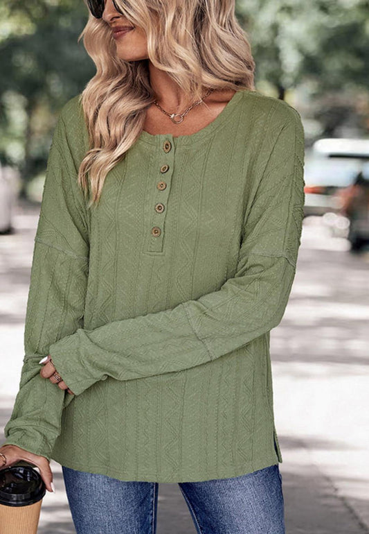 Henley Button Down Drop Shoulder Textured Long Sleeve Pullover