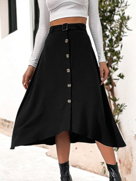 High Rise Buckled Plain Button-Up Midi A-Line Skirt