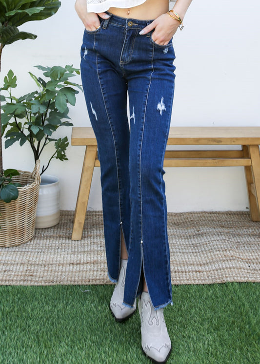 High Waist Distressed Slit Denim Jeans Long Pants with Pockets