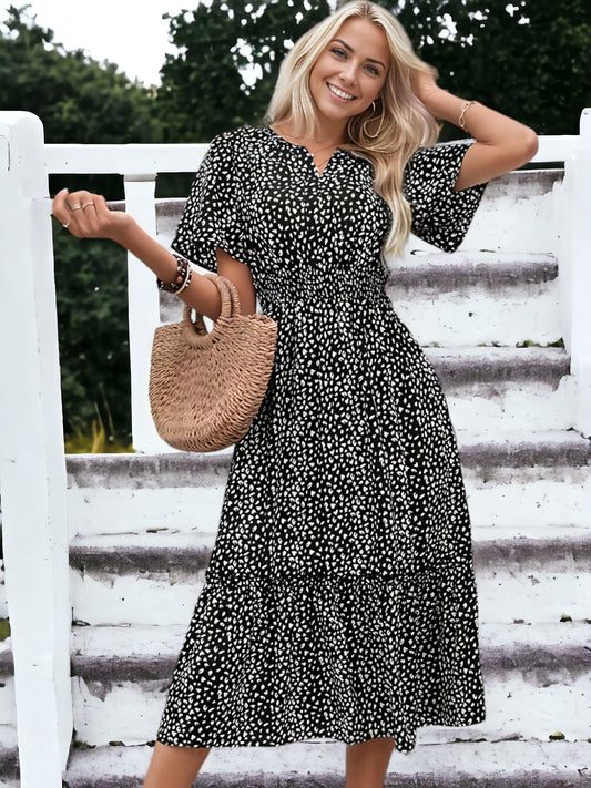 Leopard Printed Short Sleeve Smock Waist Midi Dress