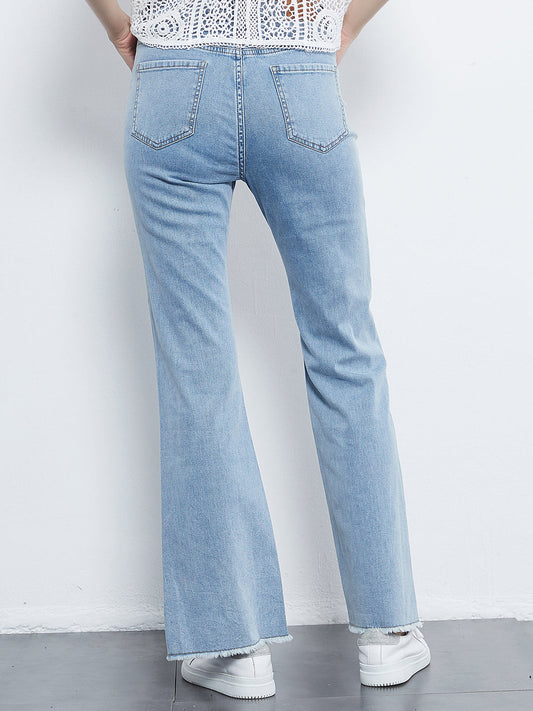 Mid Rise Slit Stretchy Straight Leg Jeans Pants with 5 Pockets