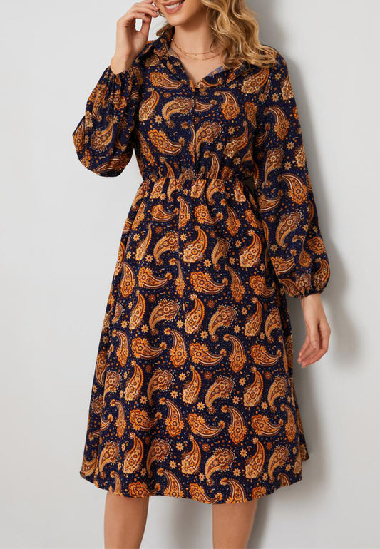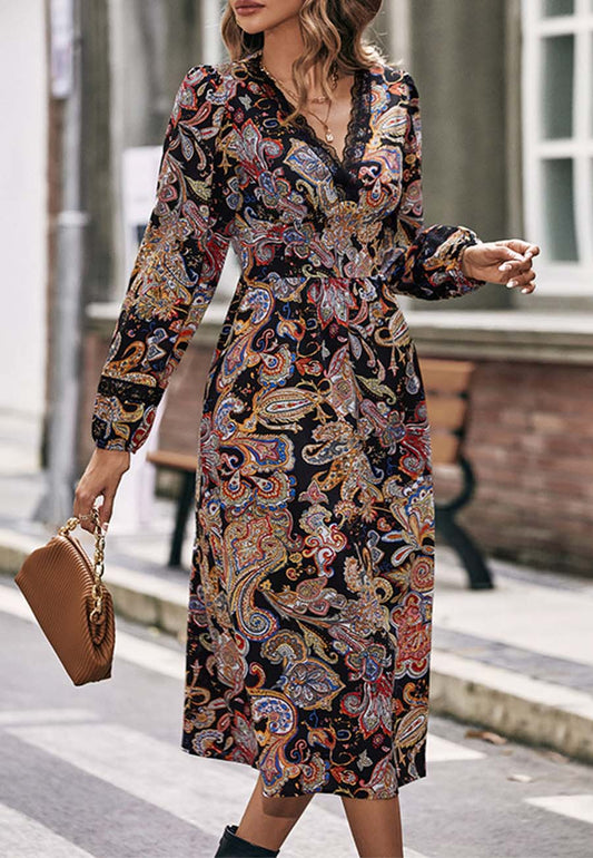 Paisley Print Lace Trim Long Sleeved Mini Dress