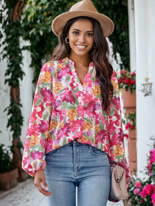 Split V Neck Multicolor Floral Blouse