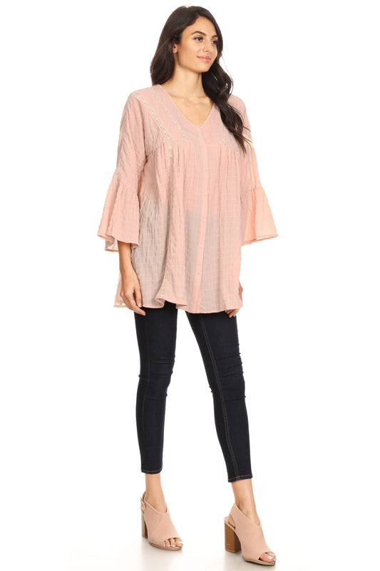 Womens Woven Crochet Button Plisse 3/4 Bell Sleeve Peasant Top,Mauve,Small