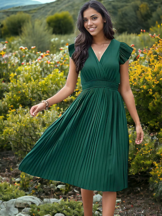 V-Neck Puff Sleeved Smocked Waist Detail Mid-Length Dress