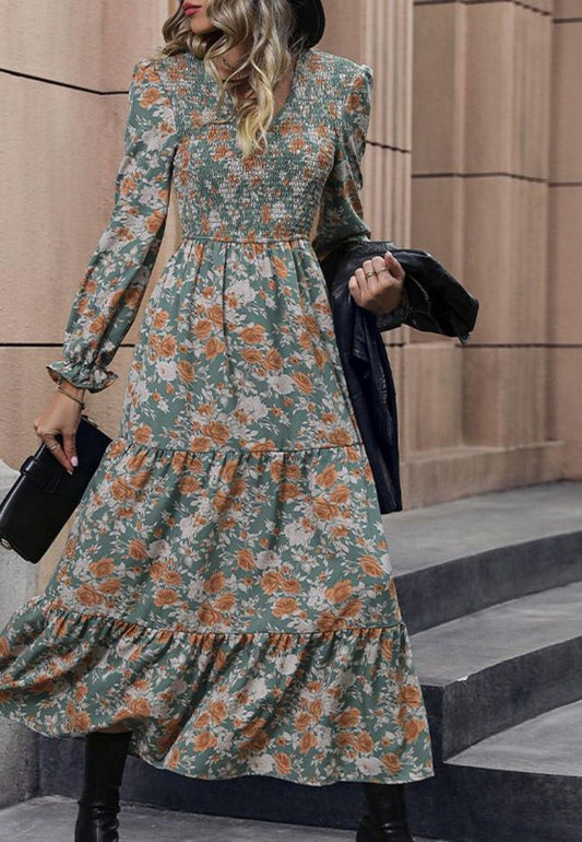 V-Neck Smocked Chest Floral Print Ruffle Detail Midi Dress
