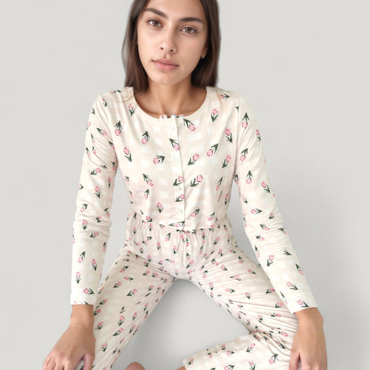 Anna-Kaci Lounge Women's Floral Print Long Sleeve Pajama Set with Contrast Piping Trim and Relaxed Button-Up Shirt