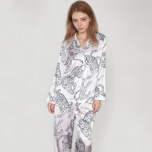 Anna-Kaci Lounge Women's Cheetah Print Woven Pajama Set with Long Sleeve Button Down Top and Relaxed Fit Straight Leg Pants