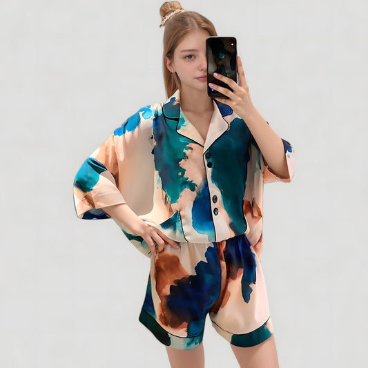 Anna-Kaci Lounge Women's Watercolor Print Pajama Set with Notch Collar Button Up Short Sleeve Top and Matching Relaxed Shorts