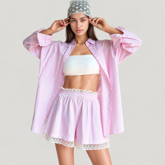 Anna-Kaci Lounge Women's Woven Pajama Set with Oversized Button Down Shirt and Lace Trim Elastic Waist Shorts