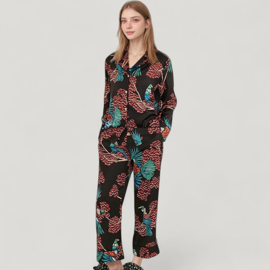 Anna-Kaci Lounge Women's Woven Two-Piece Pajama Set with Tropical Bird and Botanical Print Long Sleeve Top and Relaxed Fit Pants