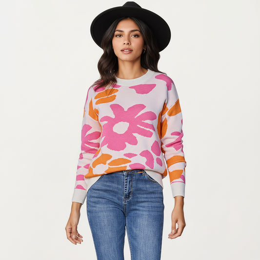 Anna-Kaci Women's Bold Graphic Floral Pattern Knit Sweater with Soft Crew Neckline and Relaxed Long Sleeve Pullover Fit
