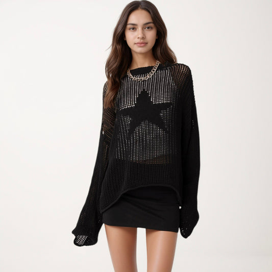 Anna-Kaci Women's Loose Knit Long Sleeve Sweater with Bold Star Design and Semi-Sheer Open Weave Texture