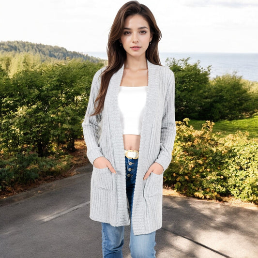 Anna-Kaci Women's Open Front Ribbed Cardigan with Long Sleeves and Front Pockets