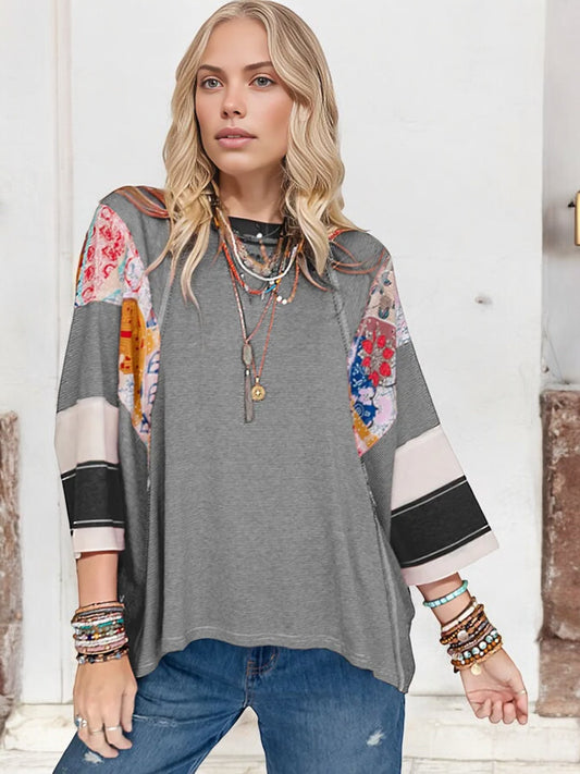 Anna-Kaci Women's Patchwork Sleeve Boho Top with 3/4 Sleeves and Relaxed Fit