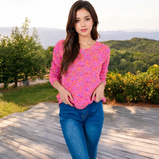 Anna-Kaci Women's Pink Confetti Knit Sweater with Crew Neck and Long Sleeves
