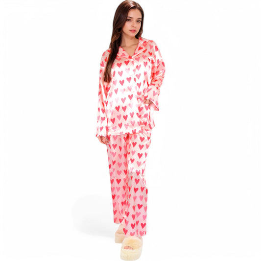 Anna-Kaci Women's Pink Heart Print Pajama Set with Button-Up Long Sleeve Top and Relaxed Fit Pants