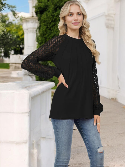 Anna-Kaci Women's Pleated Top with Lace Raglan Sleeves and Casual Fit