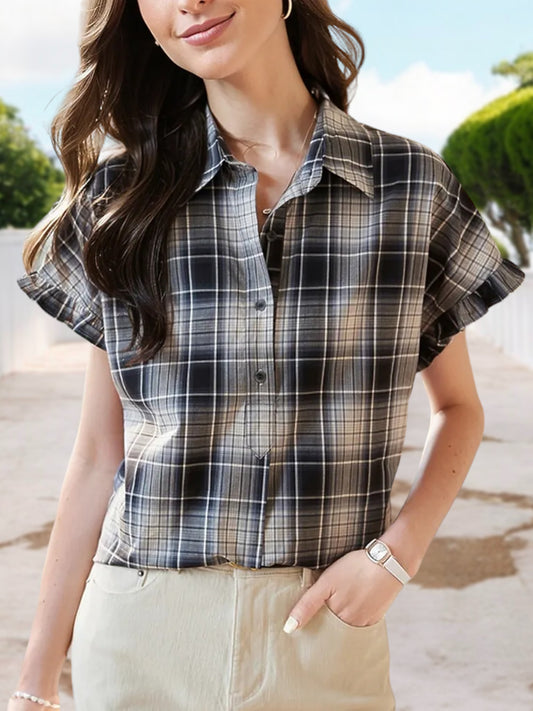 Anna-Kaci Women's Plaid Button-Down Shirt with Ruffle Cap Sleeves and Classic Collar