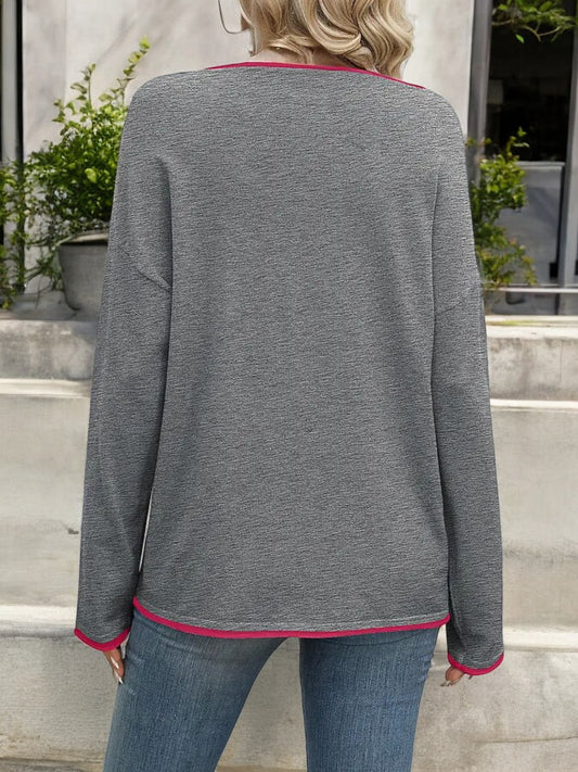 Long Sleeve Crewneck Top with Contrast Trim and Casual Fit